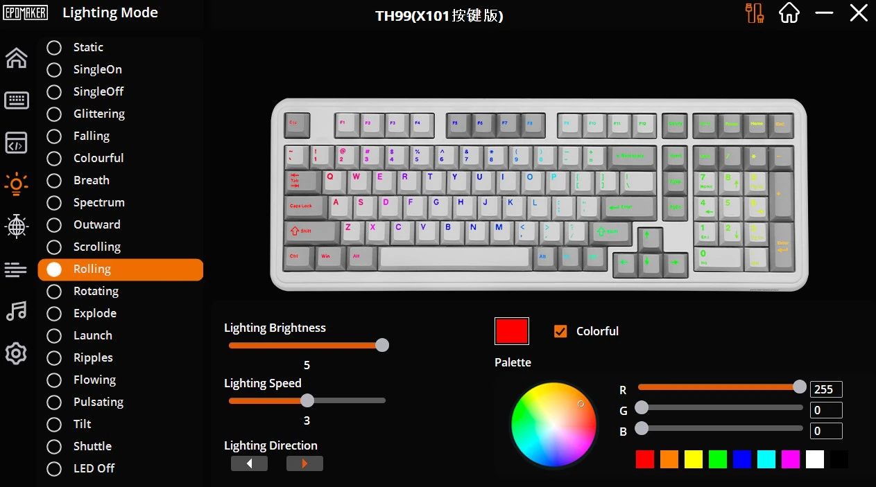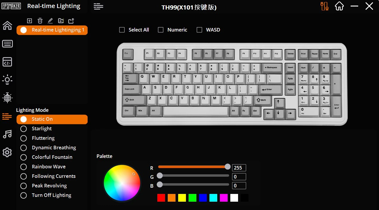 ▼RGBバックライトのカスタマイズ画面では、プリセットのエフェクトを選択したり、102個のキーごとに個別の色を設定することができる。