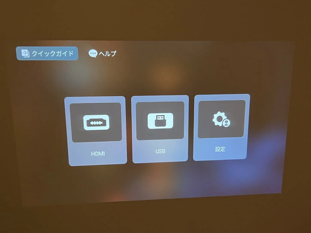 また、照射映像がきれいな長方形になっていない場合(台形になってしまっている場合)、リモコンのホームベースボタンを押して設定を開き、台形補正を "垂直自動" に設定しよう。