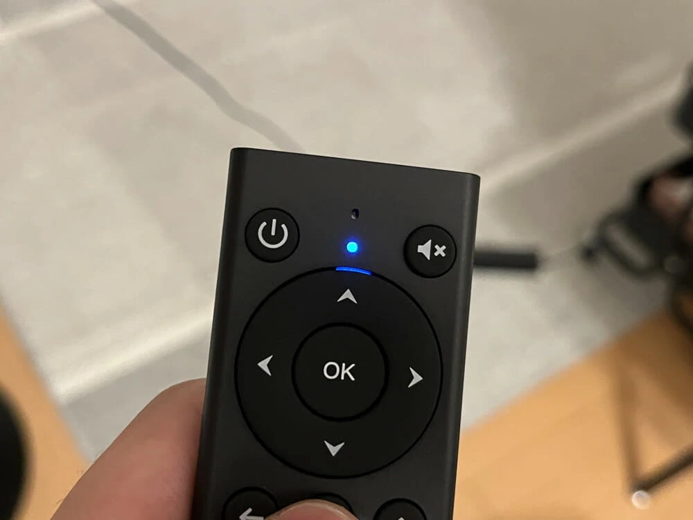 ▼リモコン中央のGoogleアシスタントボタンを押し、リモコンのマイクに向かって話しかけることで、プロジェクター上へ文字が入力される。