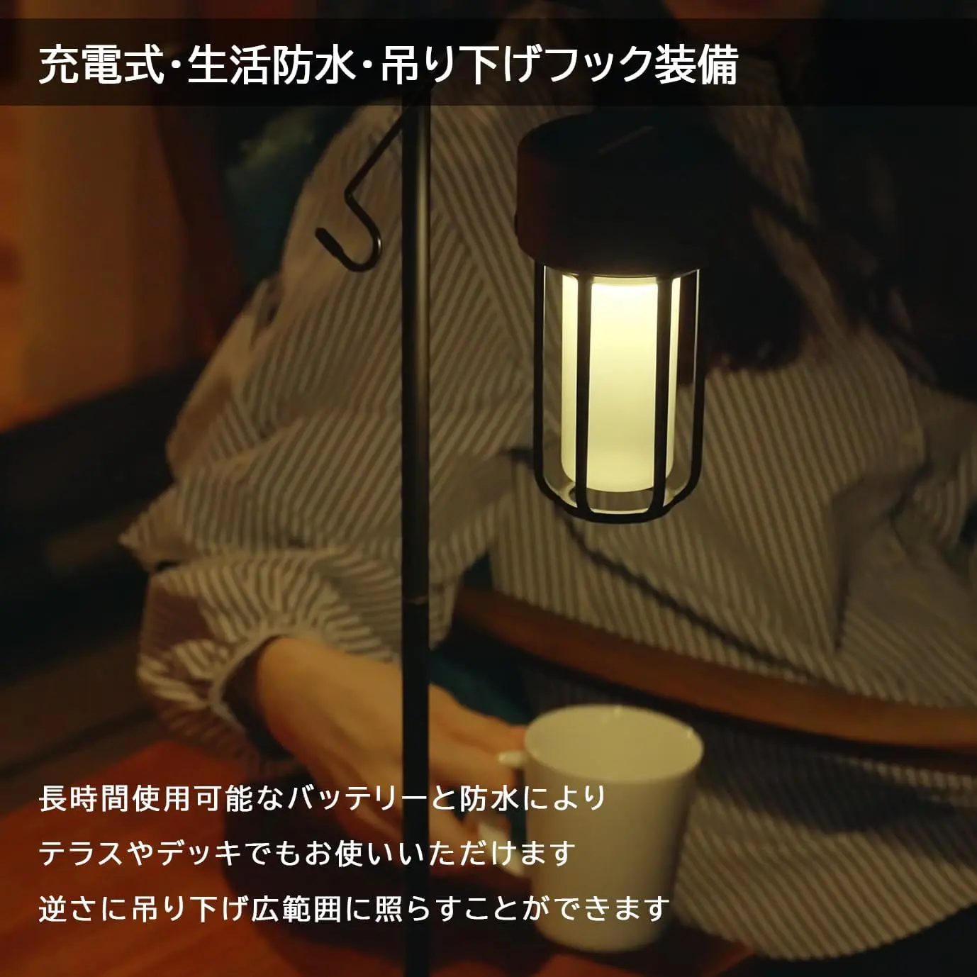 筐体底部には吊り下げ用フックが用意されており、テラスやデッキなどで上から吊るして点灯させることで、手元を柔らかい光で照らすことができる。