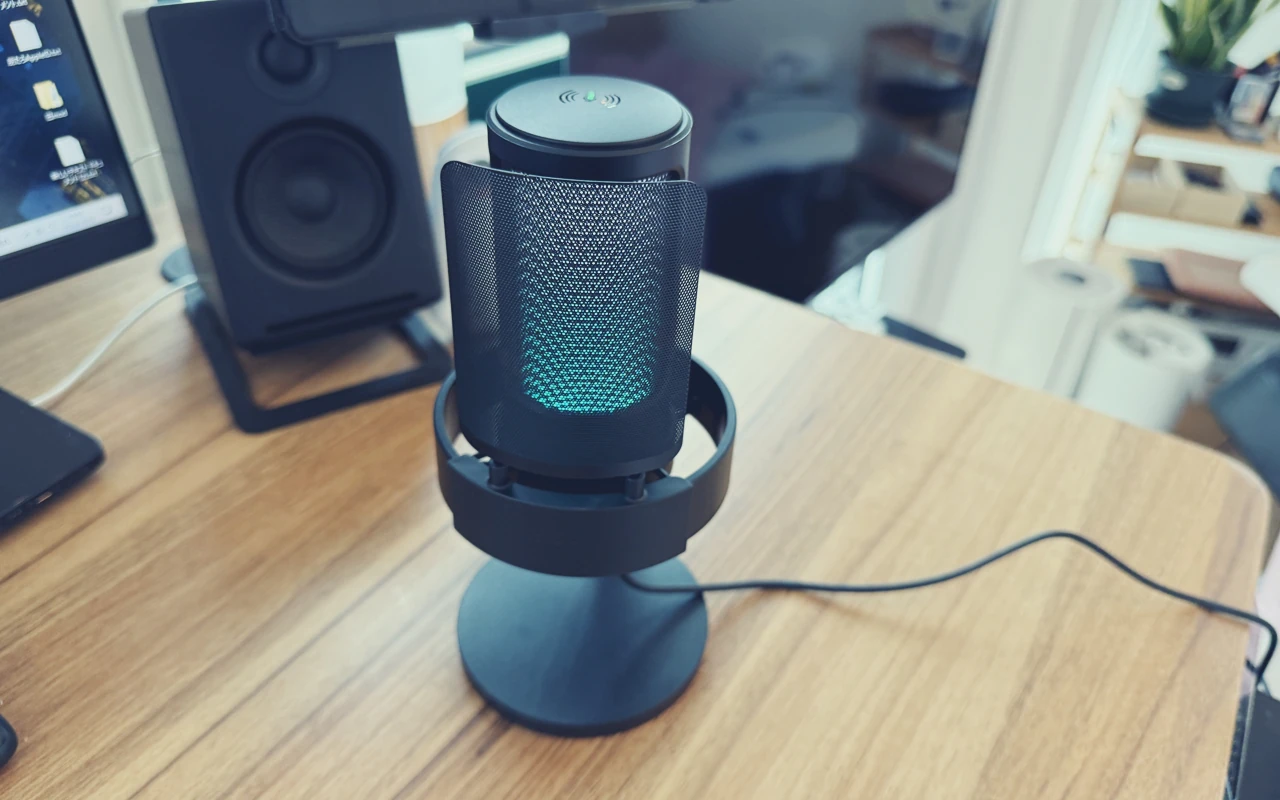 Type-C給電式のコンデンサーマイクであり、多彩な発光色を魅せるRGBライティングを内蔵。防振性能に優れたショックマウントとスタンドにより、録音時のノイズの影響を最小限に抑えることができる。