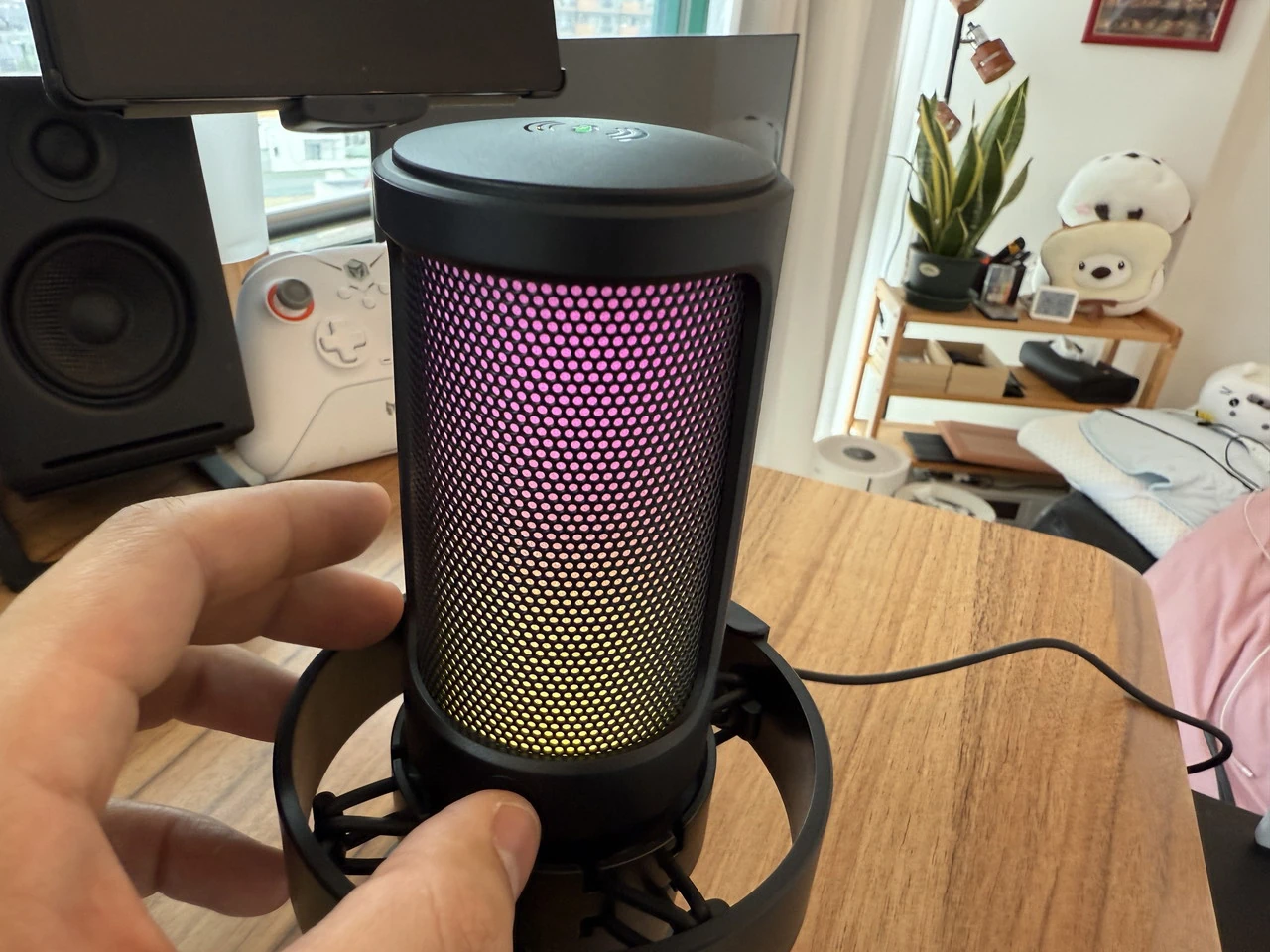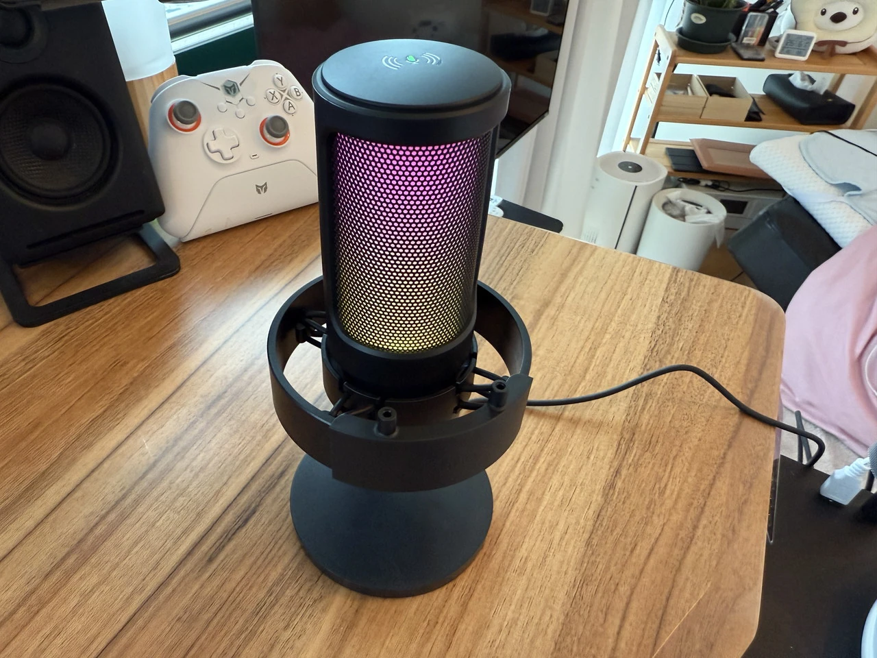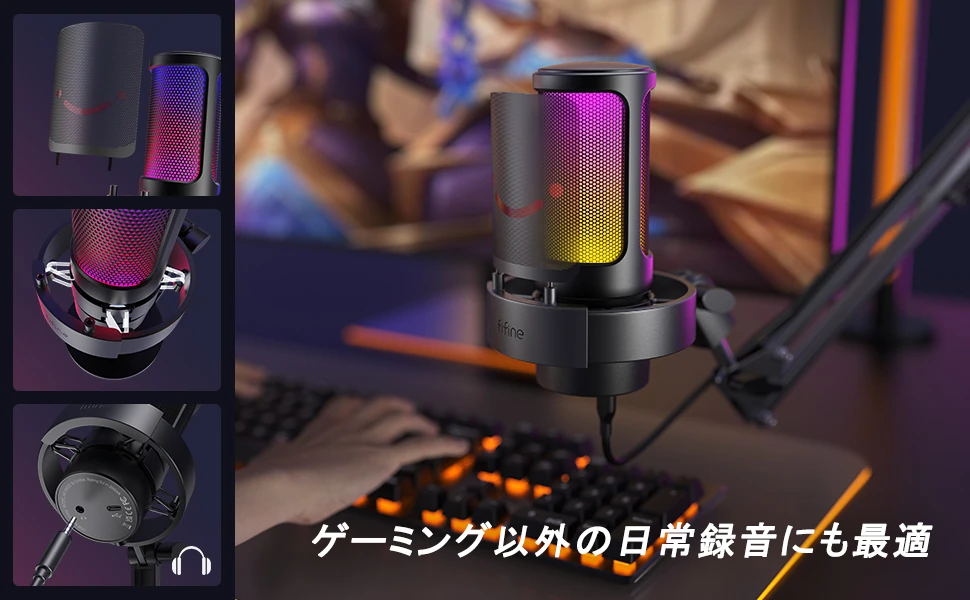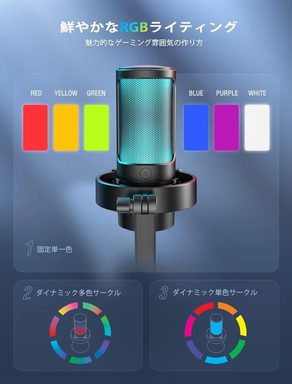 マイク本体にはRGBライトが内蔵されており、ゲーミングデバイスらしいカラフルな点灯パターンを楽しめる。