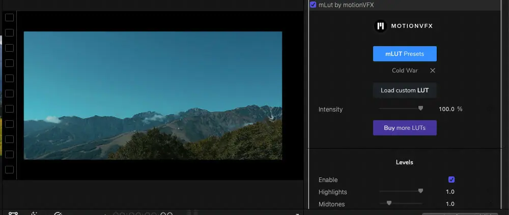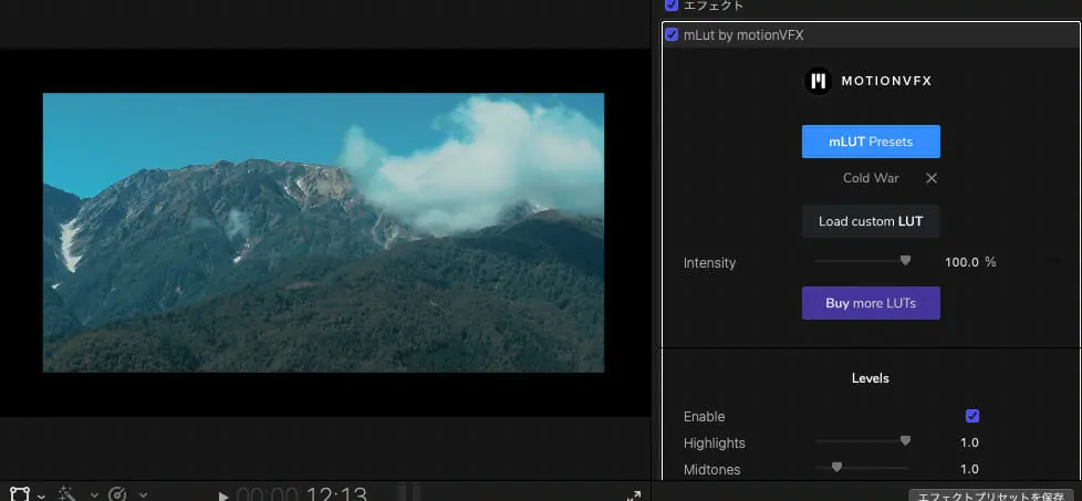 ▼カラーエフェクトをAdjustment Layerに掛けます(ここではmLut by motionVFXを使用しています)