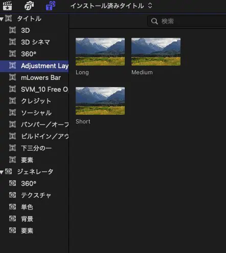 ▼Final Cut Pro内のサイドバー>タイトルに Adjustment Layerを追加することができました。