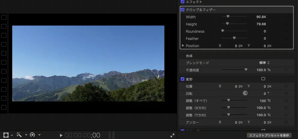 ▼配置したAdjustment Layerに「クロップ&フェザー」エフェクトをかけ、値を調整することでAdjustment Layer下のクリップ全体へクロップが適用されます。