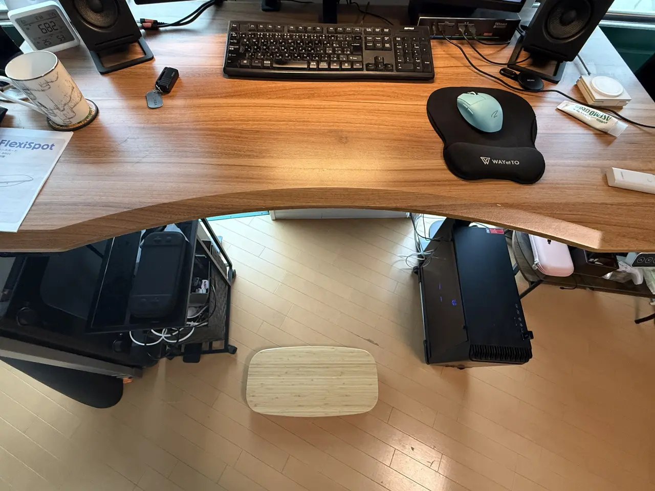 実際に、FlexiSpotのスタンディングデスクと組み合わせ、BB01の上に乗ったまま作業してみました。