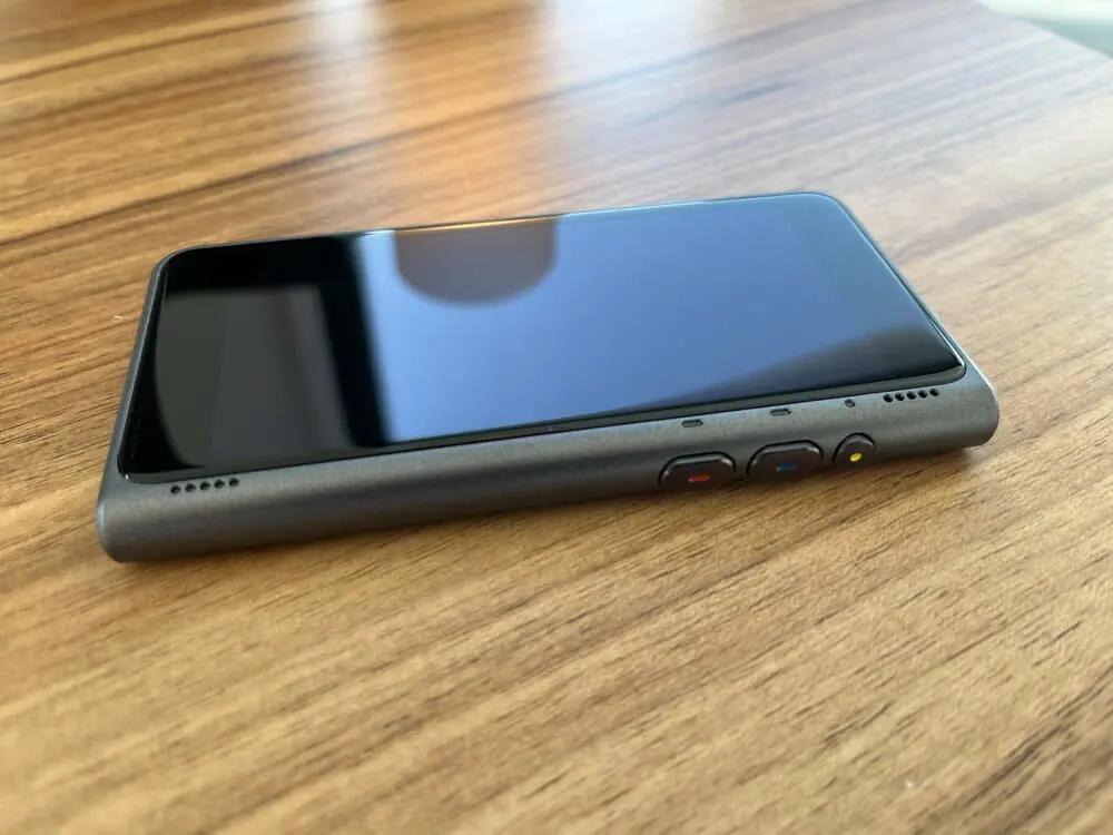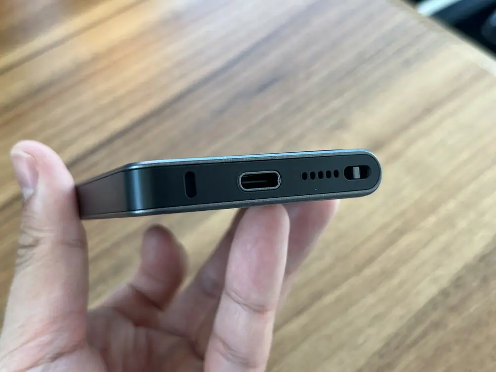 ▼下部の様子。マイクとスピーカーに加えて、充電用Type-Cポート、ストラップホールが用意。