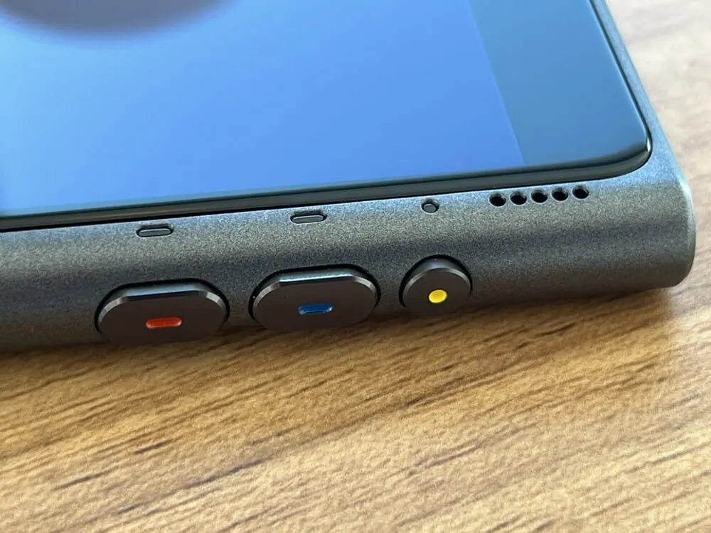 ▼画像左から母国語ボタン(赤色)、外国語ボタン(青色)、電源ボタンが搭載。
