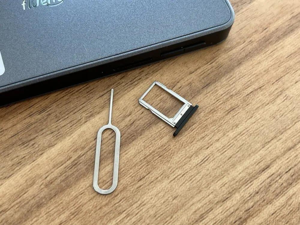 ▼付属のピンを用いてカードスロットを開き、nano SIMカードの挿入が可能。
