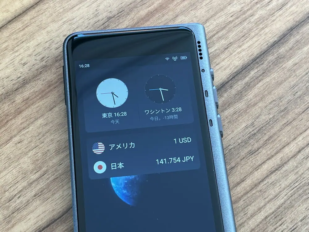 ▼画面を左にスライドすると、世界時計や為替レートが表示される。表示内容は設定からカスタマイズ可能だ。