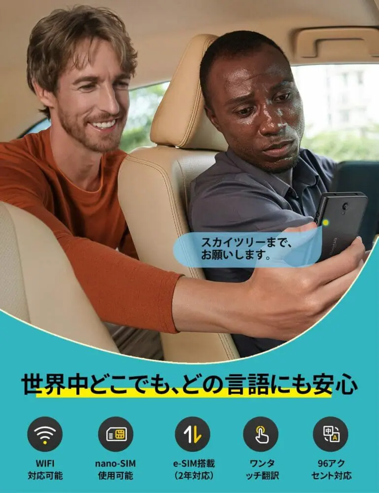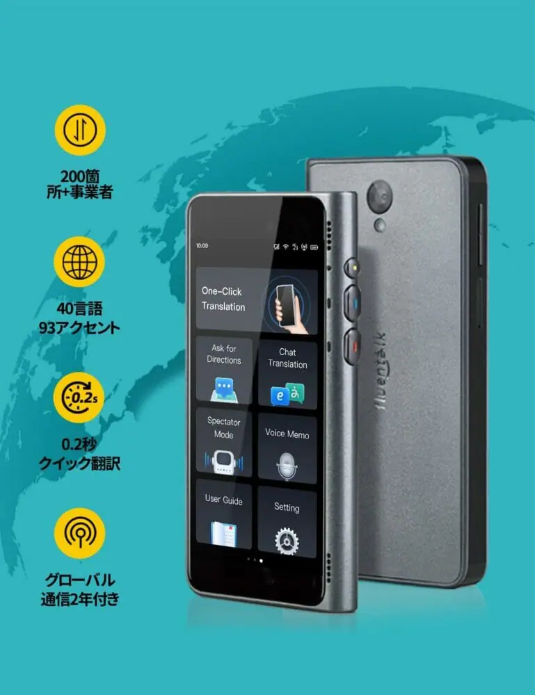 世界のほとんどの国や地域をカバーする40言語対応の高性能翻訳機であり、オンライン翻訳・オフライン翻訳のいずれにも対応。海外旅行でのあらゆる場面に備えた「ワンタップ翻訳モード」をはじめとする豊富な機能が搭載された翻訳機となっている。