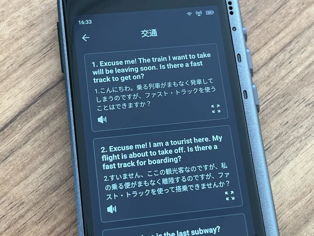 本製品には、一般的な旅行会話のテンプレートが用意されており、場面に応じて機会音声による読み上げ付きで会話を投げかけることができる。