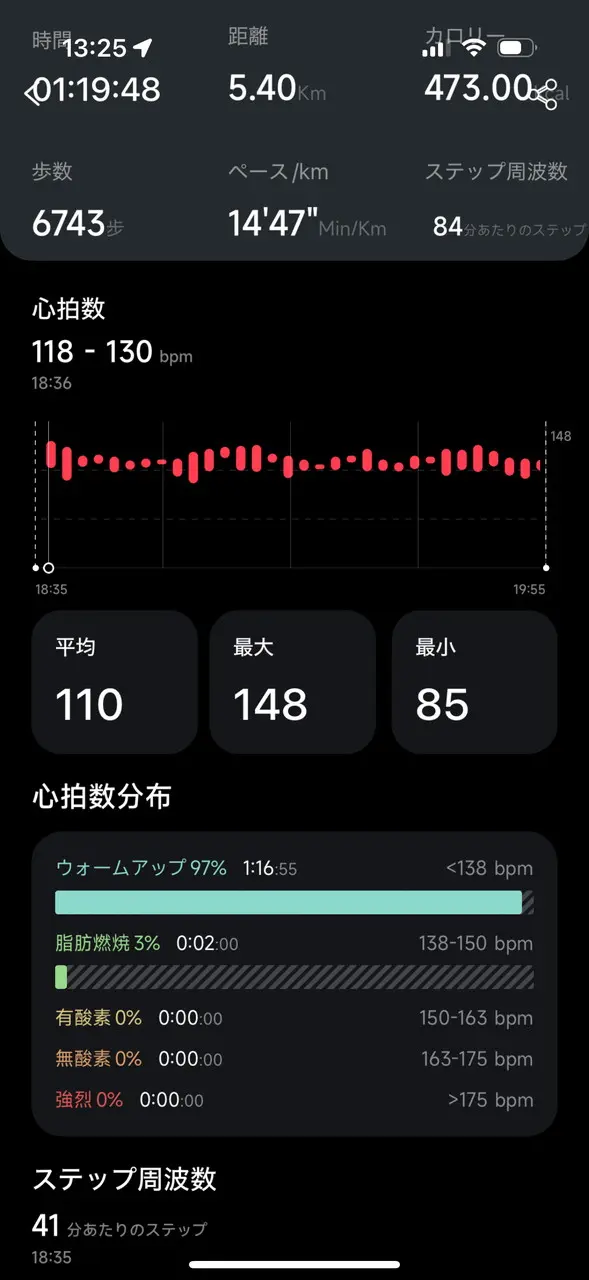 ▼心拍数の変動や分布、ステップ変動など、詳細なデータを把握できる。また、それらの指標から、運動全体のレベルも表示される。
