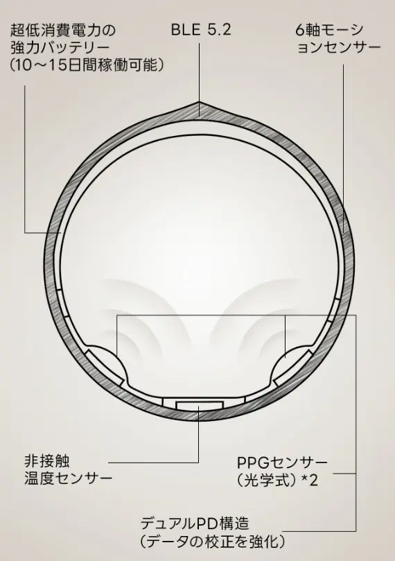 リング内側には、高精度センサー(光学式PPGセンサー、非接触温度センサー、6軸モーションセンサー)が内蔵されている。また、デュアルPD構造を採用しており、データ校正の強化を図っている。
