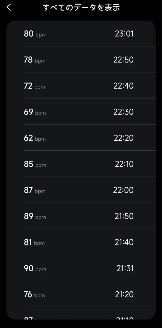 「心拍数」では、一日の心拍数を記録し、閲覧できる。