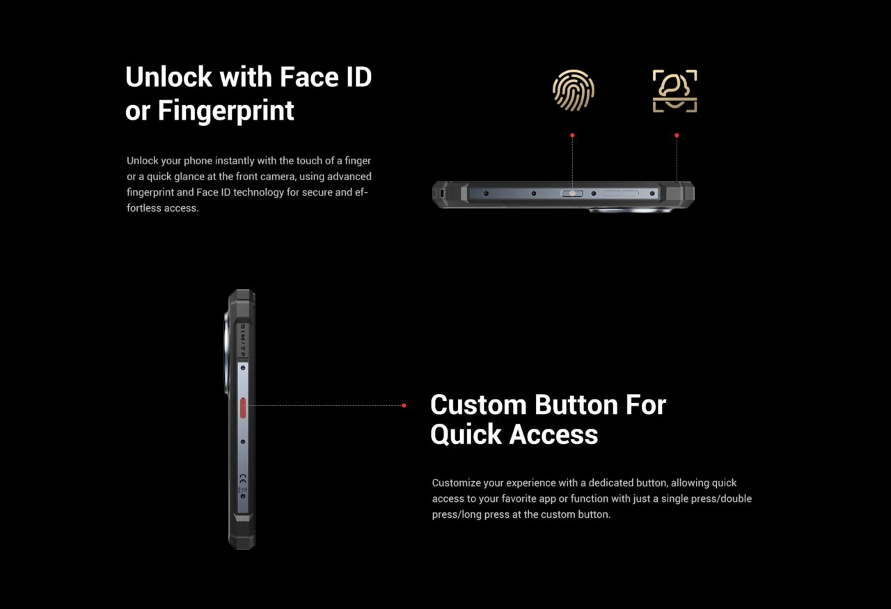 指紋認証、顔認証によるロック解除に対応。左側面には様々な機能を割り当てることのできるカスタムボタンを搭載している。