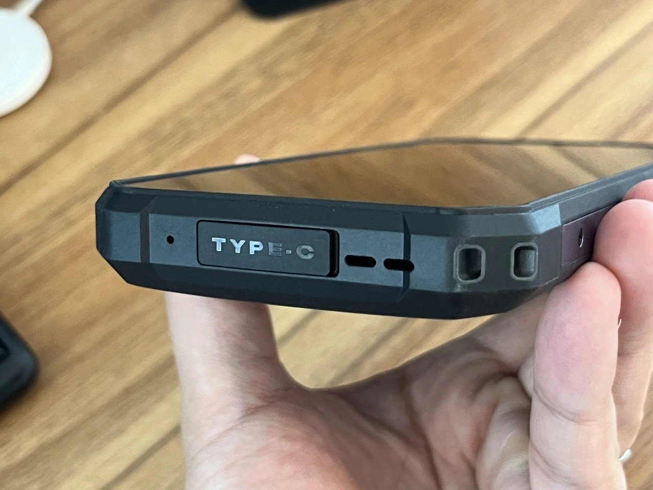 ▼スマホ株の様子。Type-Cポートおよびスピーカー穴が用意。右下角にはストラップ装着用の穴も空いている。