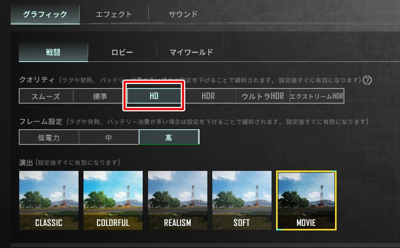 まずグラフィッククオリティに関しては『HD』まで選択できた。