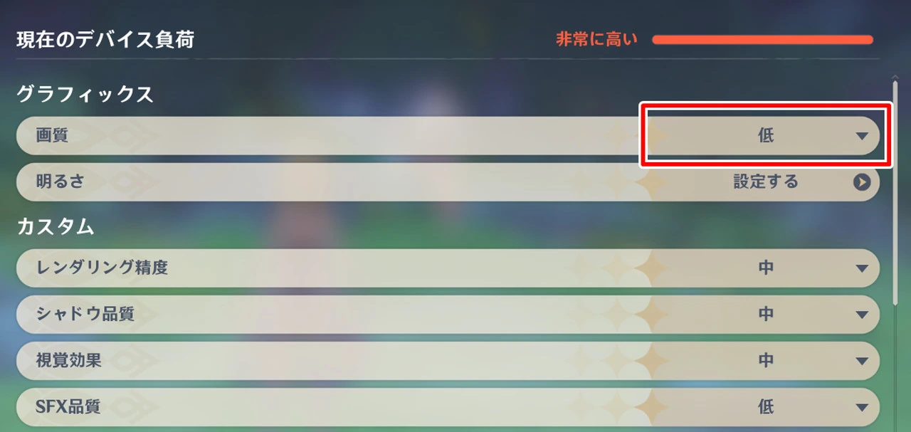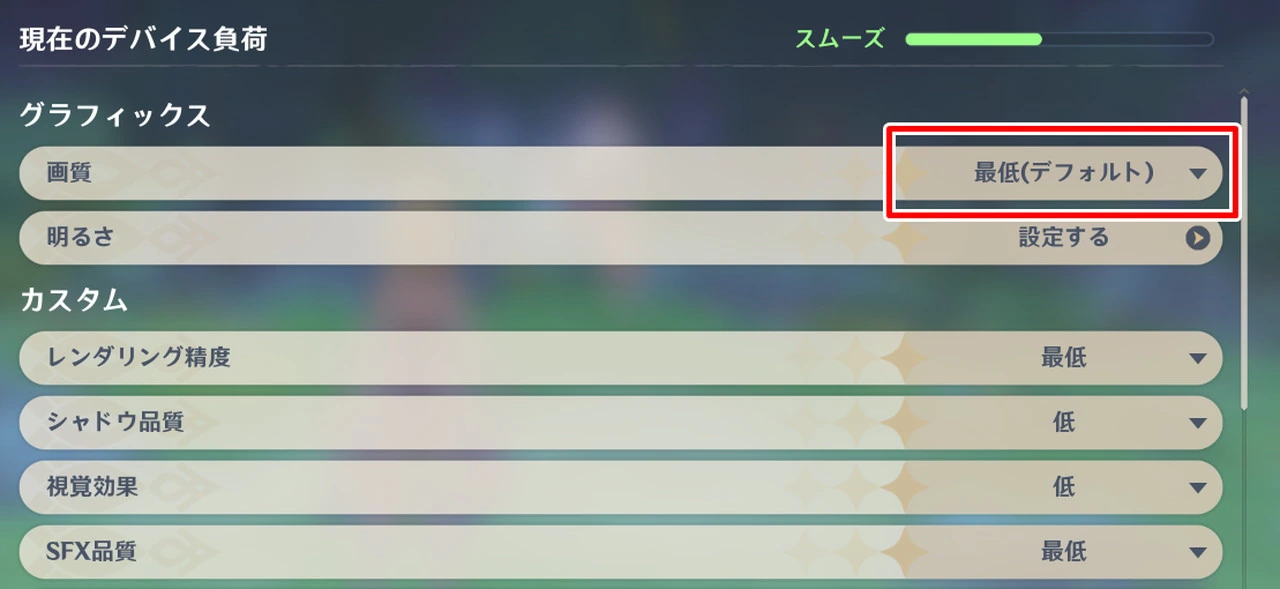 ▼画質設定はデフォルト状態で "最低" に設定されており、デバイス負荷は "スムーズ" の状態。