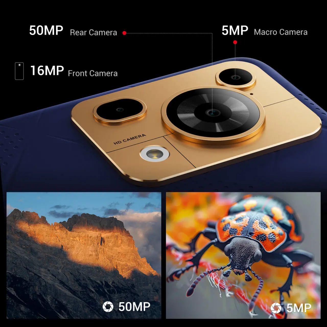 前面に16MPフロントカメラを、背面に50MPメイン+5MPマクロカメラを備えており、高精細な写真撮影が可能。