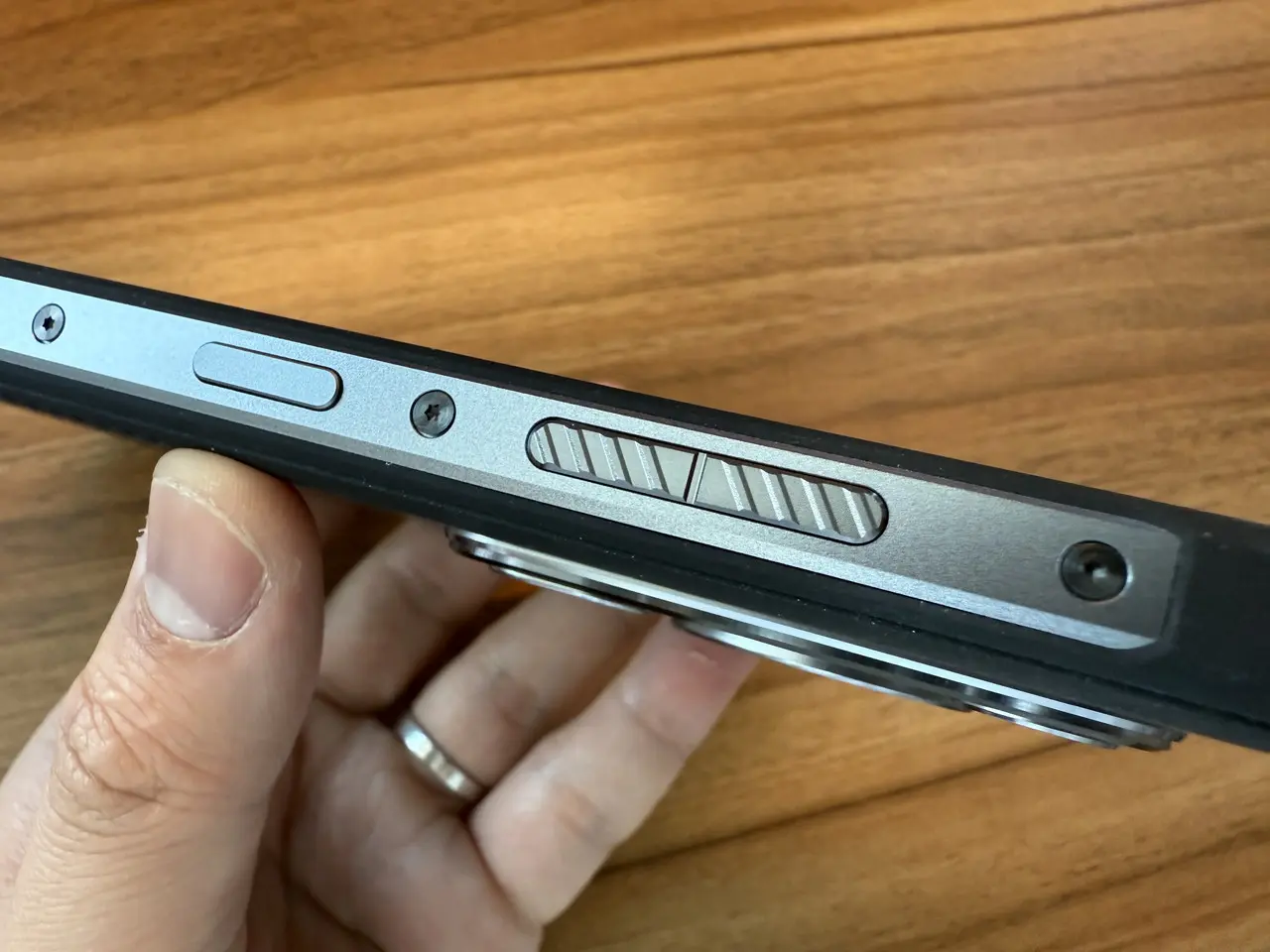 ▼音量調節ボタンには立体感のあるストライプが入っており、指でボタンを識別しやすくなっている。
