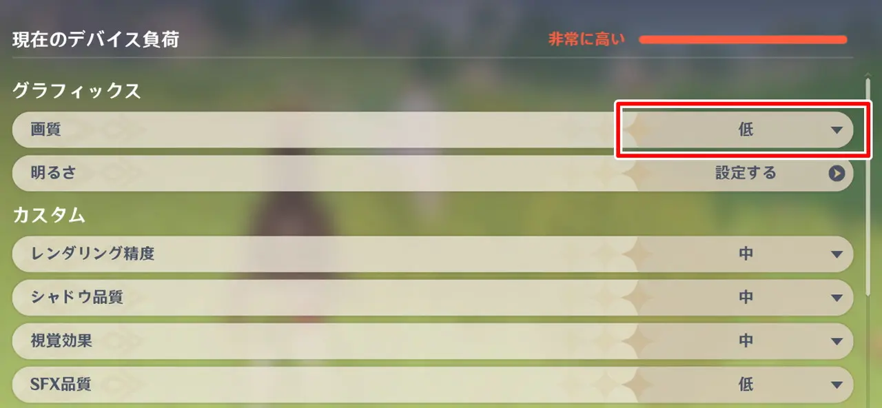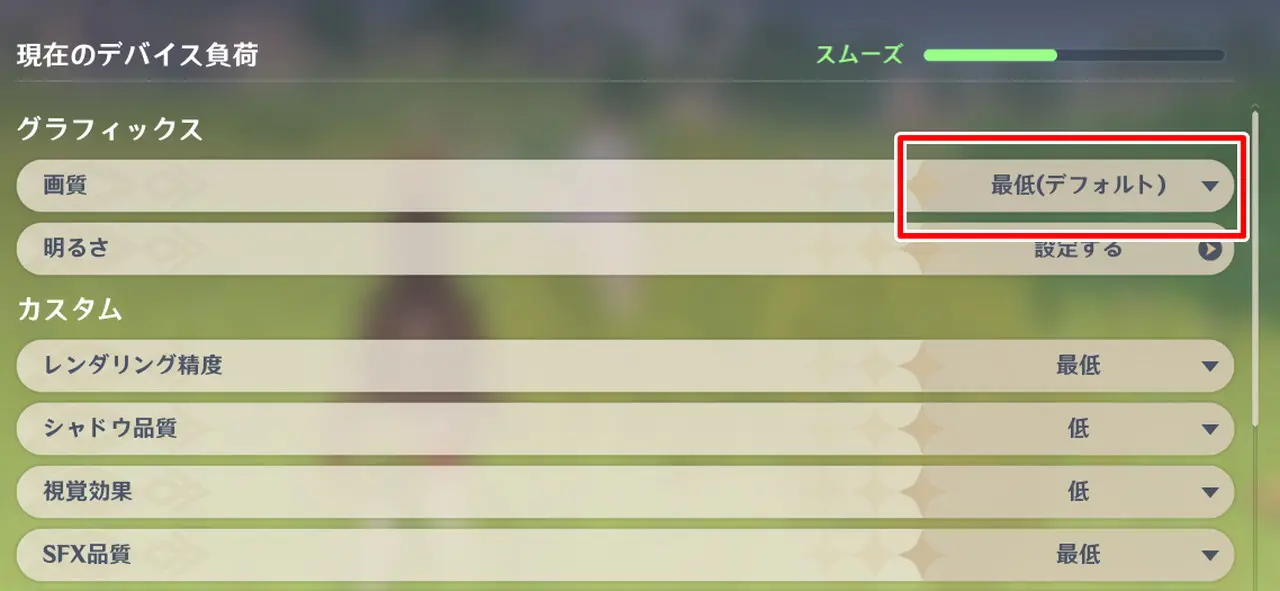 ▼画質設定はデフォルト状態で "最低" に設定されており、デバイス負荷は "スムーズ" の状態。
