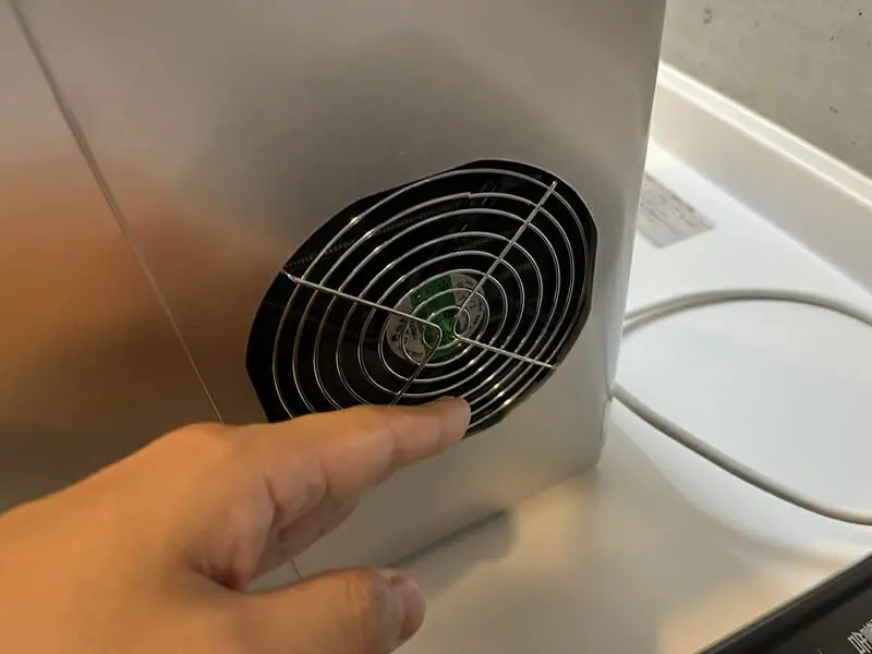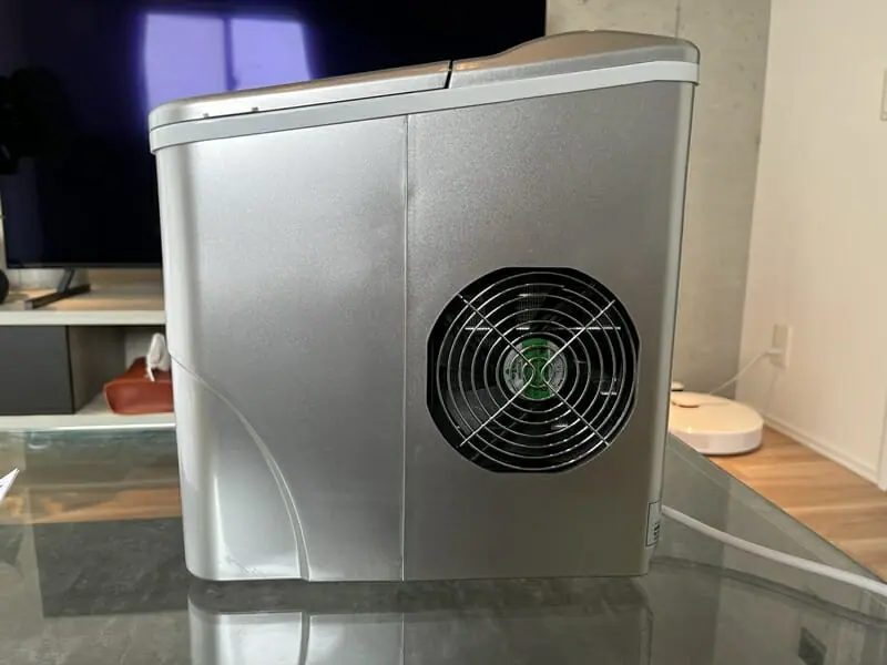 ▼製氷中は側面の排気口から暖かい風が吹き出される。周囲の温度が若干上がるため、なるべく広い場所に設置しておくと良いだろう。