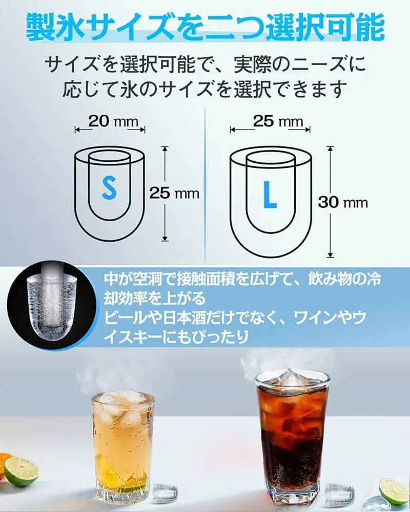 製氷サイズは大小2種類から選択可能。製氷される氷は中が空洞になっており、液体との接触面積が大きくとられていることで、スピーディに冷やすことが可能となっている。