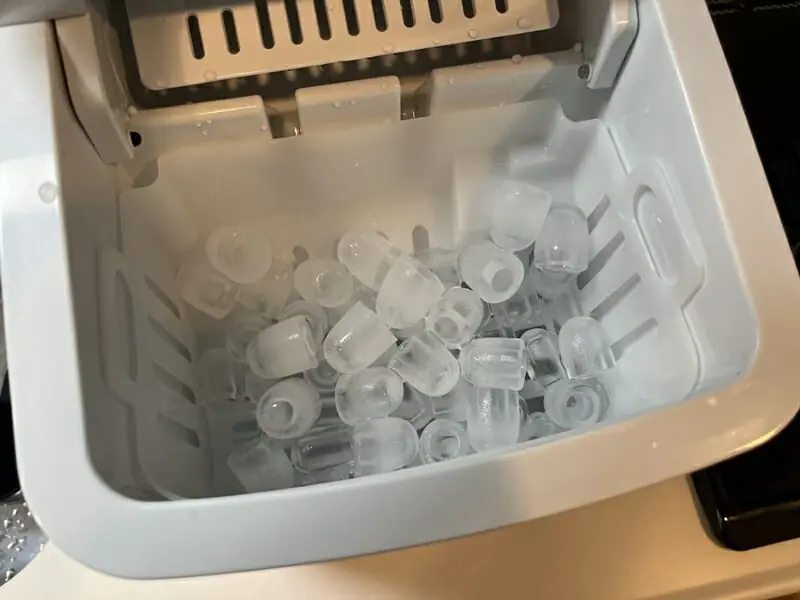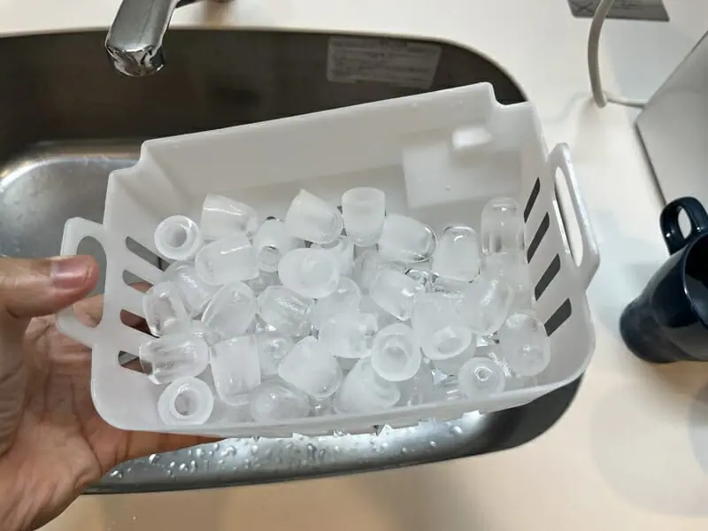 ▼30分ほど稼働させた後のバスケット。50個近くの氷が溜まっている。