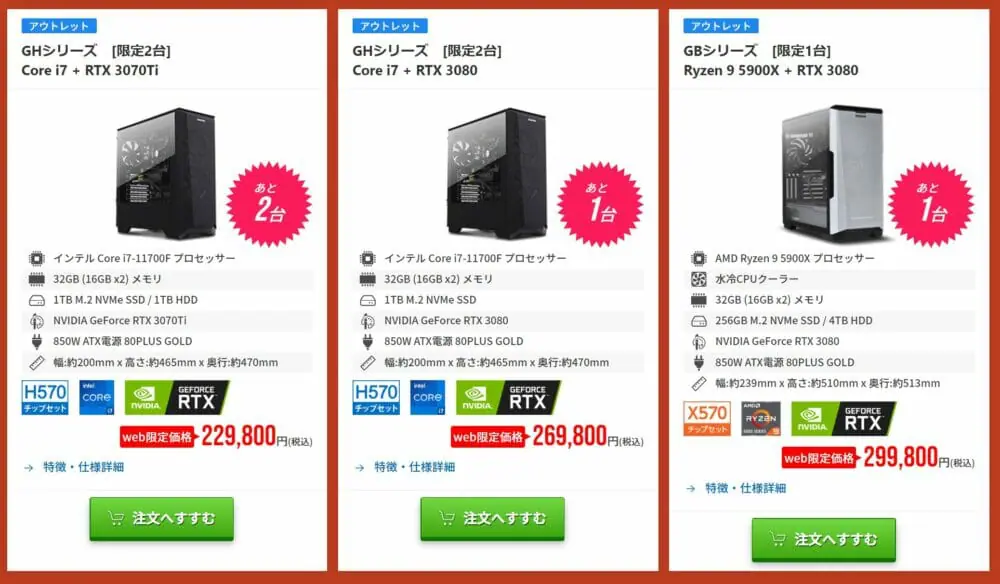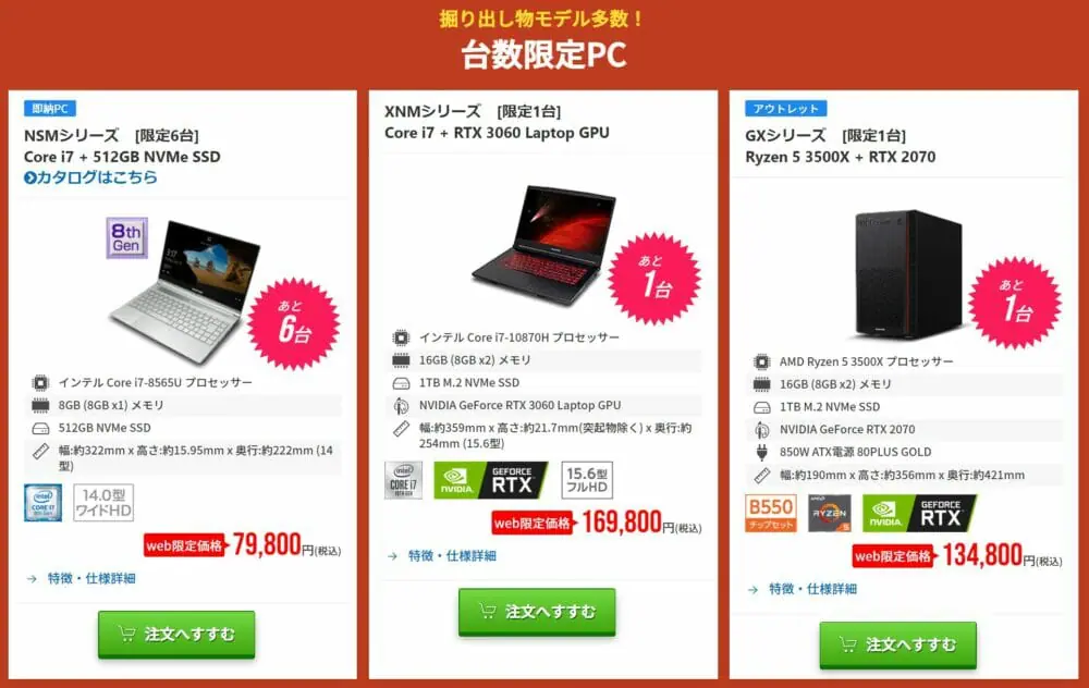 ▼RTX3000台搭載モデルが限定特価で販売されていますが、台数限定のため早めに購入することをオススメします。
