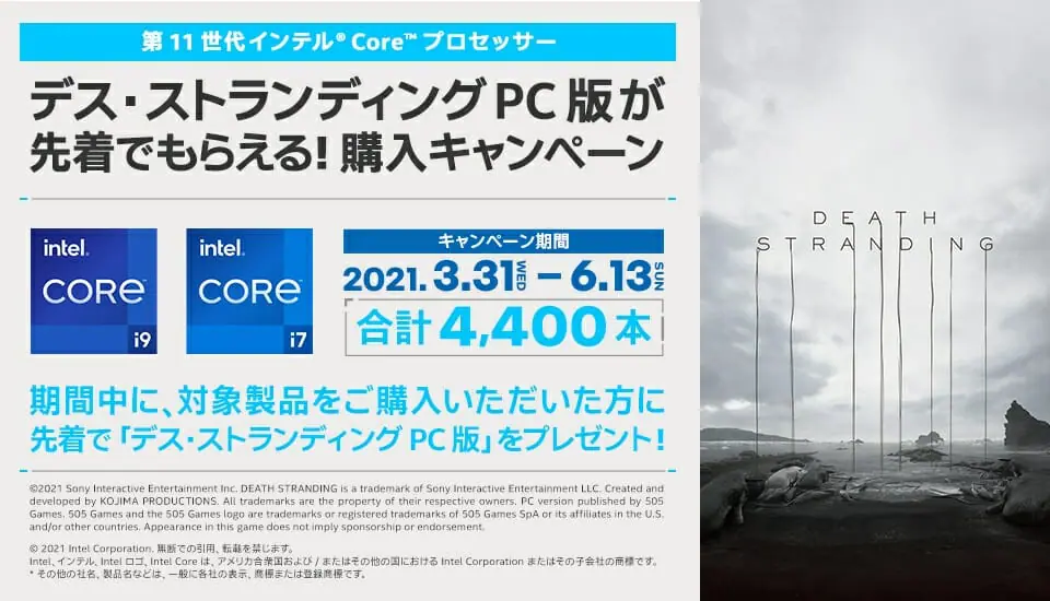 - 特典内容:キャンペーン期間中に対象プロセッサーを搭載したPC購入で、デス・ストランディング PC 版(Steamダウンロード券)を無料プレゼント