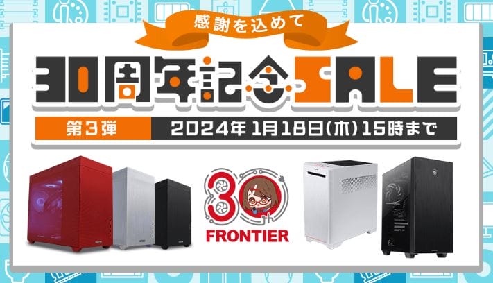 今回実施される『FRONTIER 30周年記念SALE』では、ハイエンド級からミドル級まで、非常に幅広い価格帯のゲーミングPCがセール対象となっています。
