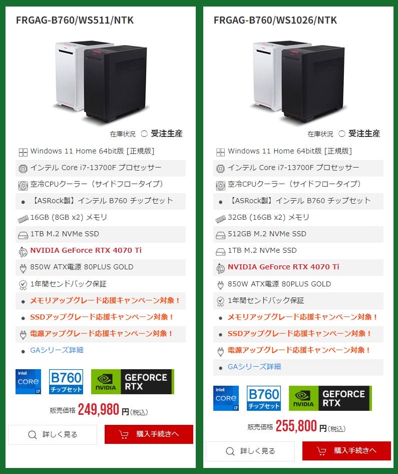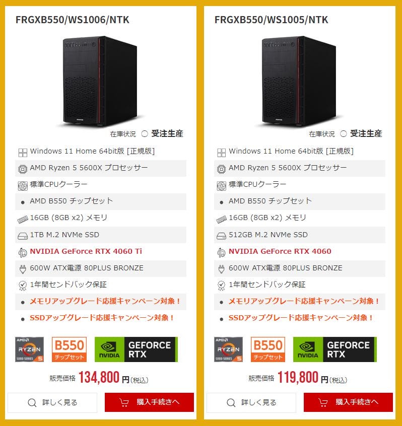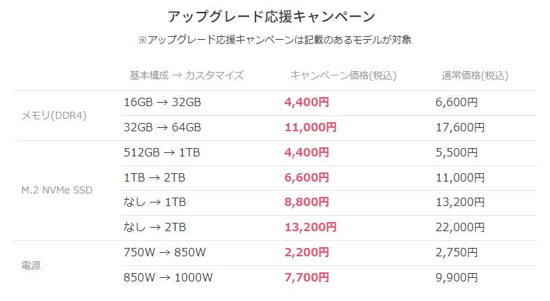 なお、一部のモデルはメモリ増設&SSD&電源カスタマイズの割引キャンペーン対象となっています。