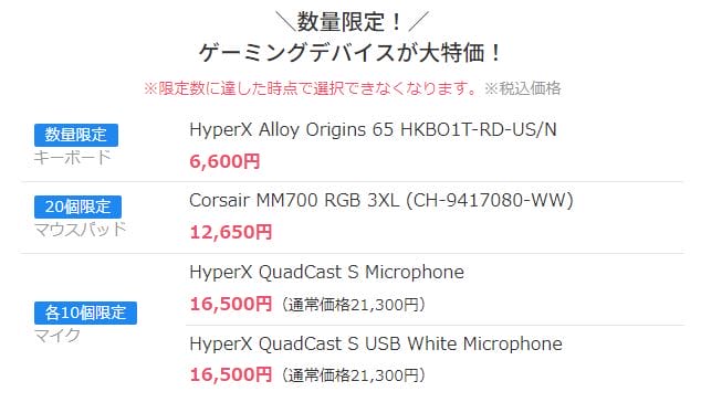 ▼ゲーミングデバイスを数量限定の特価で購入できるキャンペーンも実施。