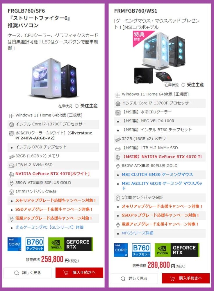 ▼RTX4070Ti+第13世代Core i7搭載モデルは、税込24万円台の大特価に。