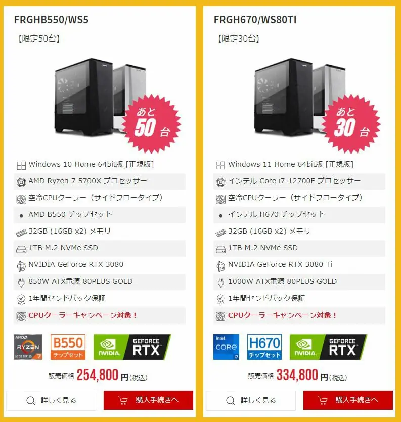 なお、今回のセールではCPUクーラーカスタマイズキャンペーンも実施されており、より上位モデルのCPUクーラーへのカスタマイズ金額が 4,400円(税込)⇒ 3,300円(税込)の割引価格となっています。