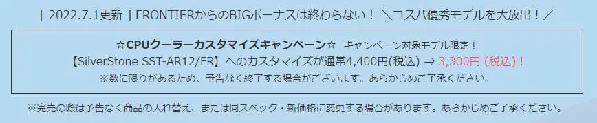 また、今回のセールではCPUクーラーカスタマイズキャンペーンも実施されており、より上位モデルのCPUクーラーへのカスタマイズ金額が 4,400円(税込)⇒ 3,300円(税込)の割引価格となっています。