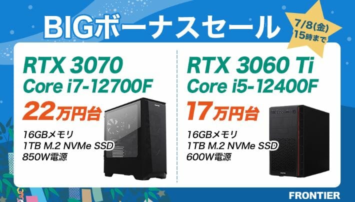 同サイトにおいて、人気の高いRTX3000台グラフィックボードを搭載したハイエンドゲーミングPCを、非常にお得な価格で購入出来る フロンティア『BIGボーナスセール』が開催されます。