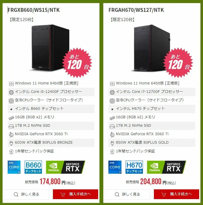 ▼そしてなんと第12世代Core i5+RTX3060Ti搭載モデルが税込17万円台の大特価に!売り切れ必至です。