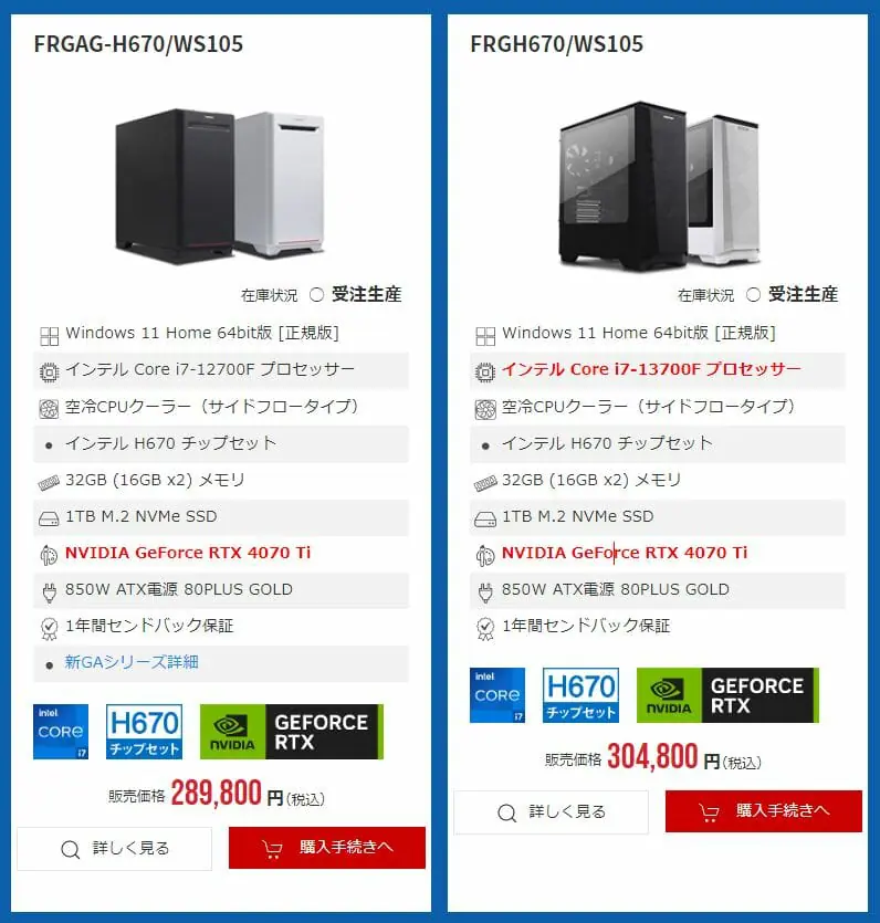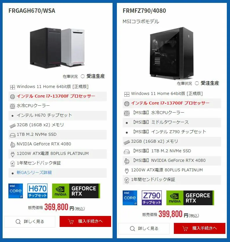 最新のRTX4070TiやRTX4080搭載モデルがラインナップに並んでいる点も要注目。