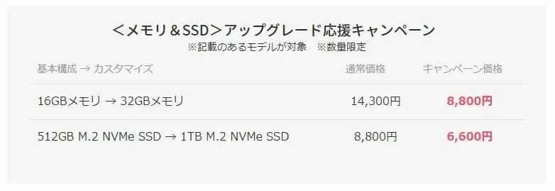 また、一部のモデルはRAM(メモリ)やSSDをお得にカスタマイズできるキャンペーンの対象となっています。