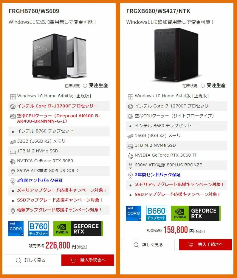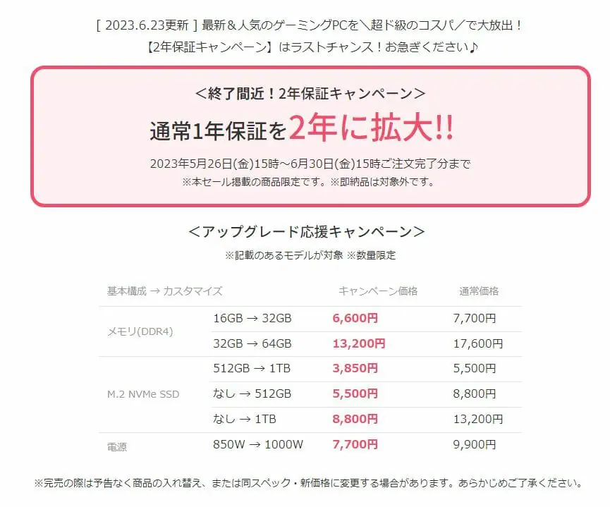 なお、一部のモデルはメモリ増設&SSD&電源カスタマイズの割引キャンペーン対象となっています。2023年5月26日(金)15時~6月30日(金)15時注文分まで、保証期間が2年に拡大する特典もあり!