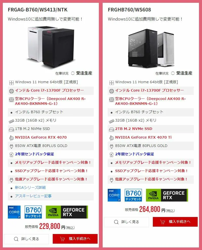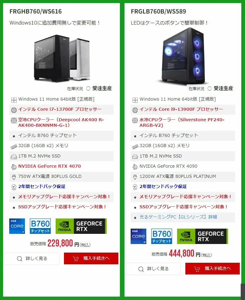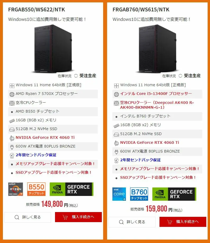 最新のRTX4060Ti搭載モデルがラインナップに並んでいる点も要注目。