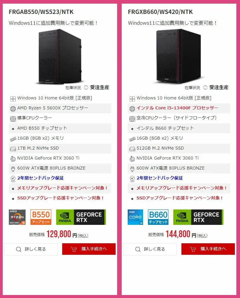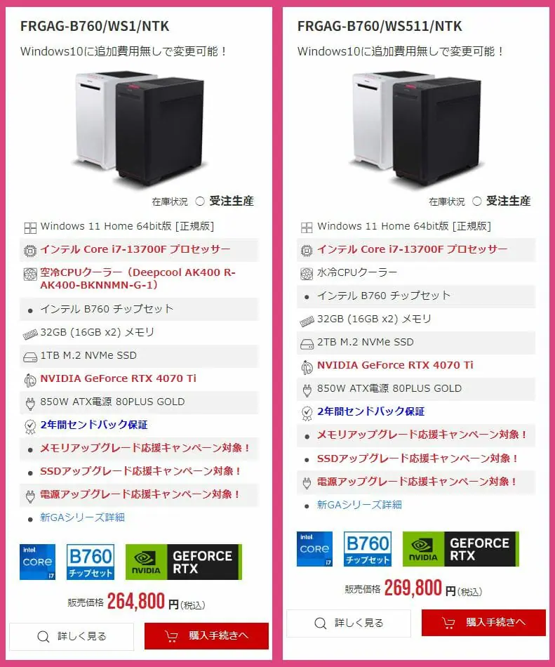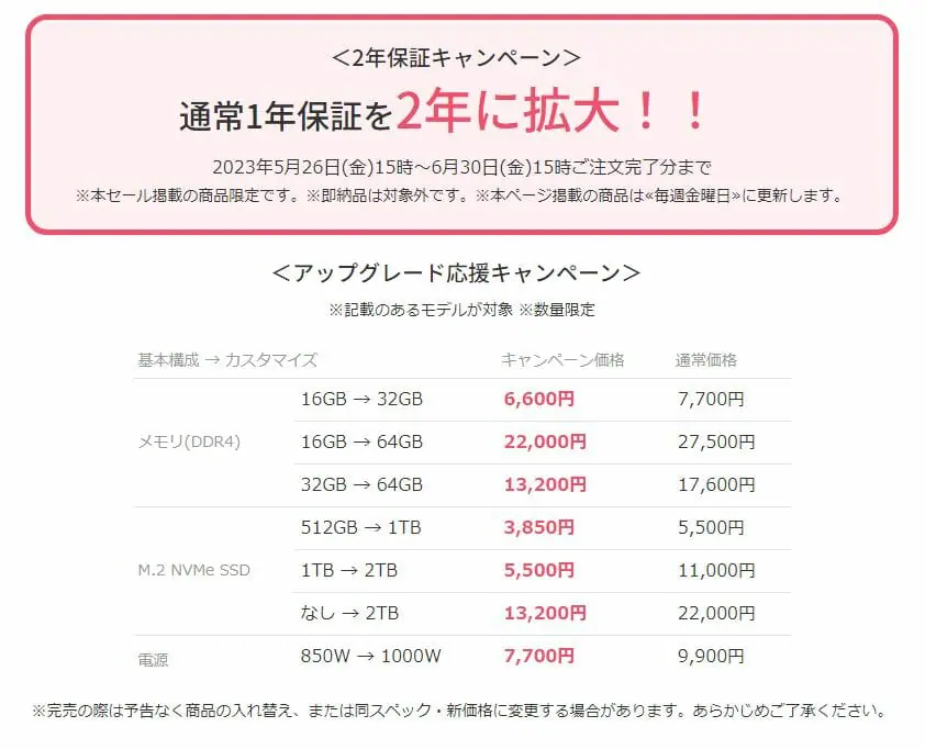 なお、一部のモデルはメモリ増設&SSD&電源カスタマイズの割引キャンペーン対象となっています。2023年5月26日(金)15時~6月30日(金)15時注文分まで、保証期間が2年に拡大する特典もあり!