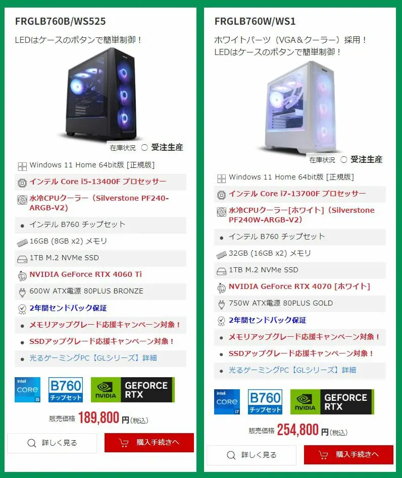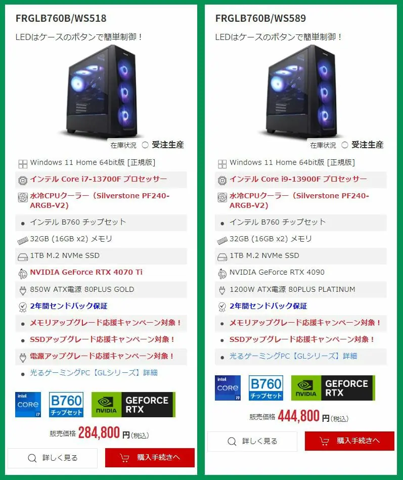 最新のRTX4060Ti搭載モデルがラインナップに並んでいる点も要注目。