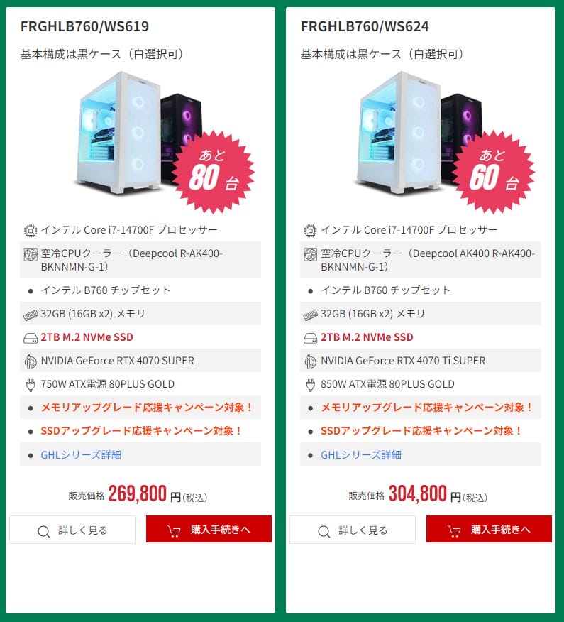 同じく最新グラボである『GeForce RTX 4070Ti SUPER』『GeForce RTX 4070 SUPER』搭載モデルもラインナップに含まれています。