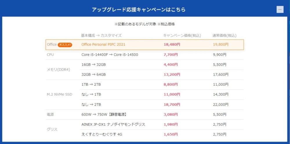 なお、一部のモデルはメモリ増設、SSD、電源カスタマイズ等の割引キャンペーン対象となっています。Officeソフトやゲーミングヘッドセットも割引対象です!
