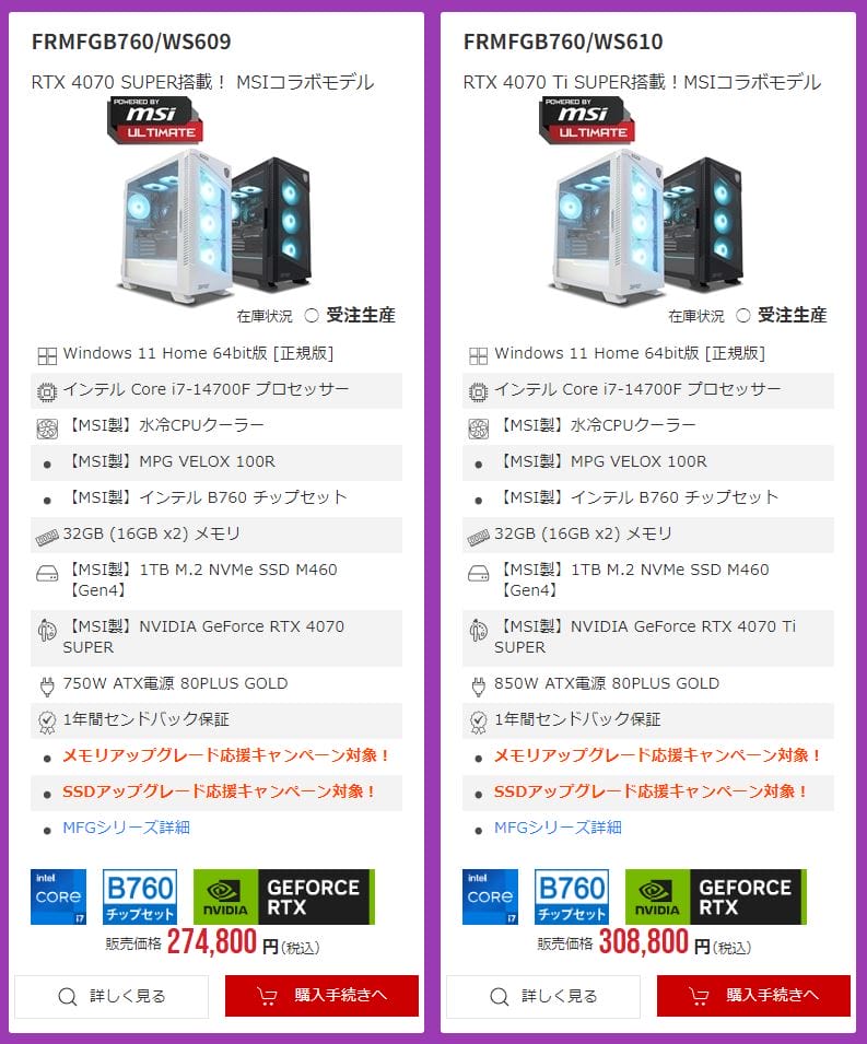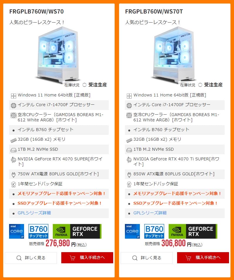 特に最新グラボの『RTX 4080 SUPER』『RTX 4070Ti SUPER』『RTX 4070 SUPER』を搭載したモデルが用意されている点は必見!