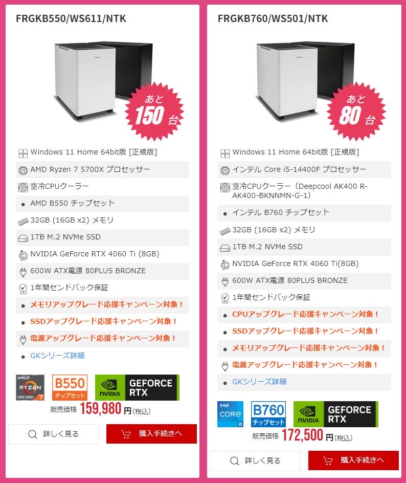 そのほか、第14世代Core CPUと『RTX4060Ti』などを搭載したお得なミドルレンジモデルも、さらにお得な価格で販売されています。