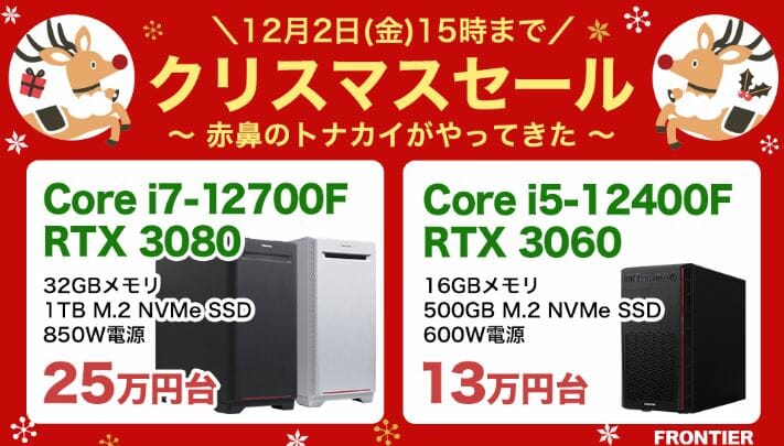 今回実施される『FRONTIER クリスマスセール ~ 赤鼻のトナカイがやってきた ~』では、ハイエンド級からミドル級まで、非常に幅広い価格帯のゲーミングPCがセール対象となっています。